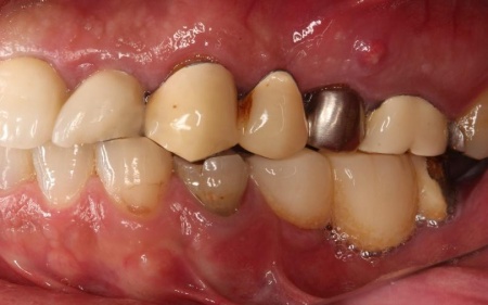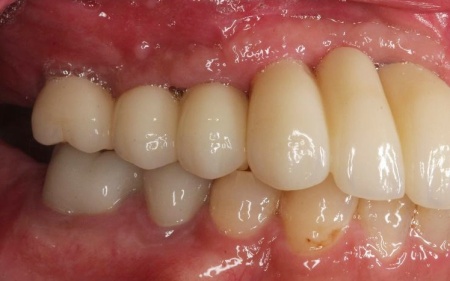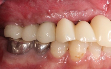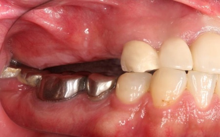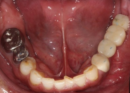 他院で治療を行った左下奥歯3本のインプラントは、土台をそのまま活かして人工歯だけ作り直し、噛み合わせを調整します。
