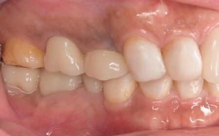 「20代のころから、痛いときだけ歯科医院に通っていた。歯が折れたり抜けたりしたため、複数の歯をつなげた被せ物を装着しているが、噛みにくくなってしまった。また、最近は食いしばりもあり奥歯が痛む。複数の歯科医院で矯正治療を断られたので、解決策が見つからずに困っている」とご相談いただきました。