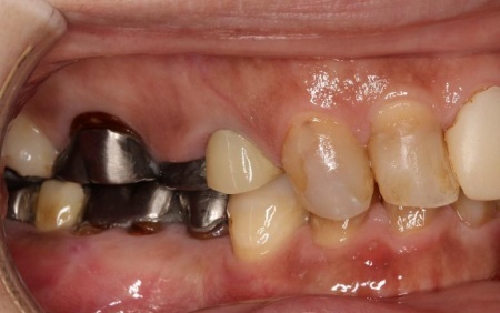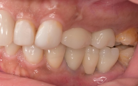 拝見したところ、もともと左上の歯と左下前歯が欠損しているうえ、奥歯の欠損も進んでいたため、噛み合わせが低くなっていました。