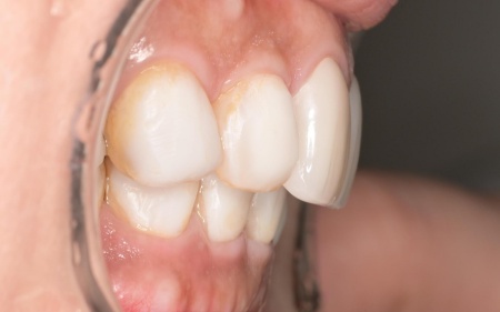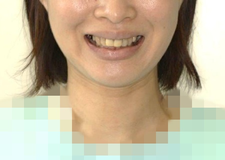 奥歯が噛み合わない状態になったことで、上前歯が前方に押し出され、出っ歯のようになっています。