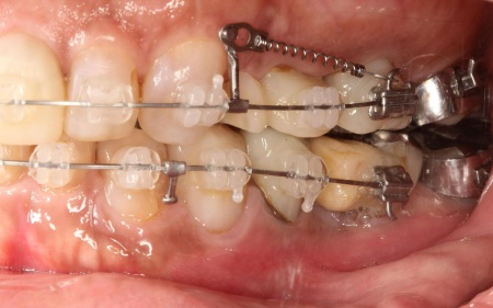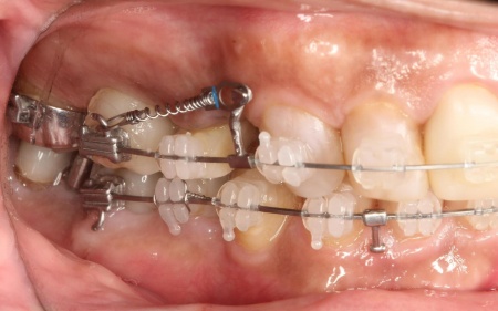 その後、ワイヤー矯正とクローズドコイル(バネの装置)を使ったスピード矯正を行い、前歯を後方に移動させます。